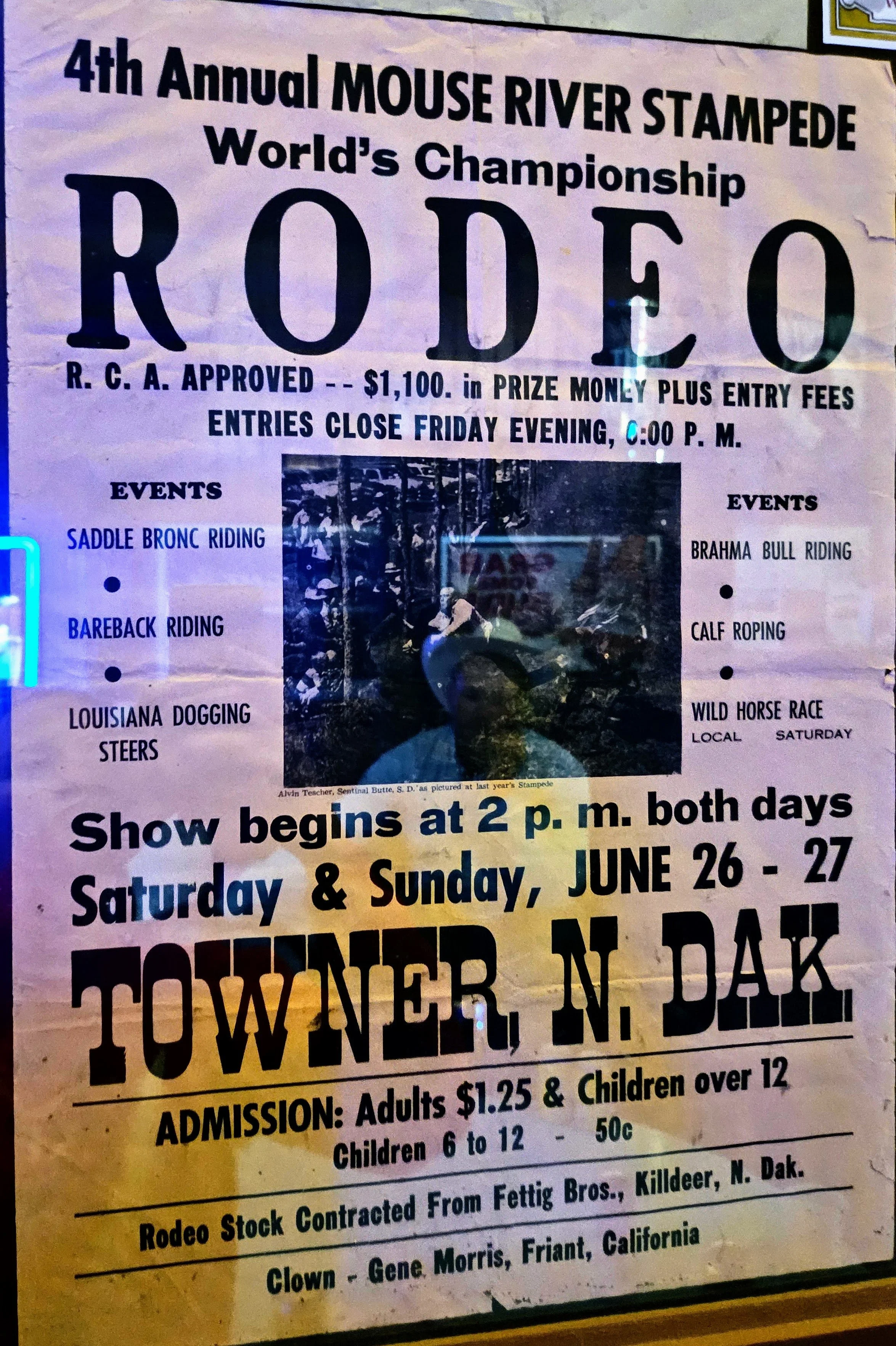 In 1958, Jim and Pat Dugan, Towner area ranchers, attempted to bring back the “Stampede” with a two-day event held in May. M.J. LaValley, a long to rancher and rodeo supporter from Granville, provided the stock. Children’s Barrel Bending was added for the children as was Musical Chairs and a Cloverleaf pattern for the women.